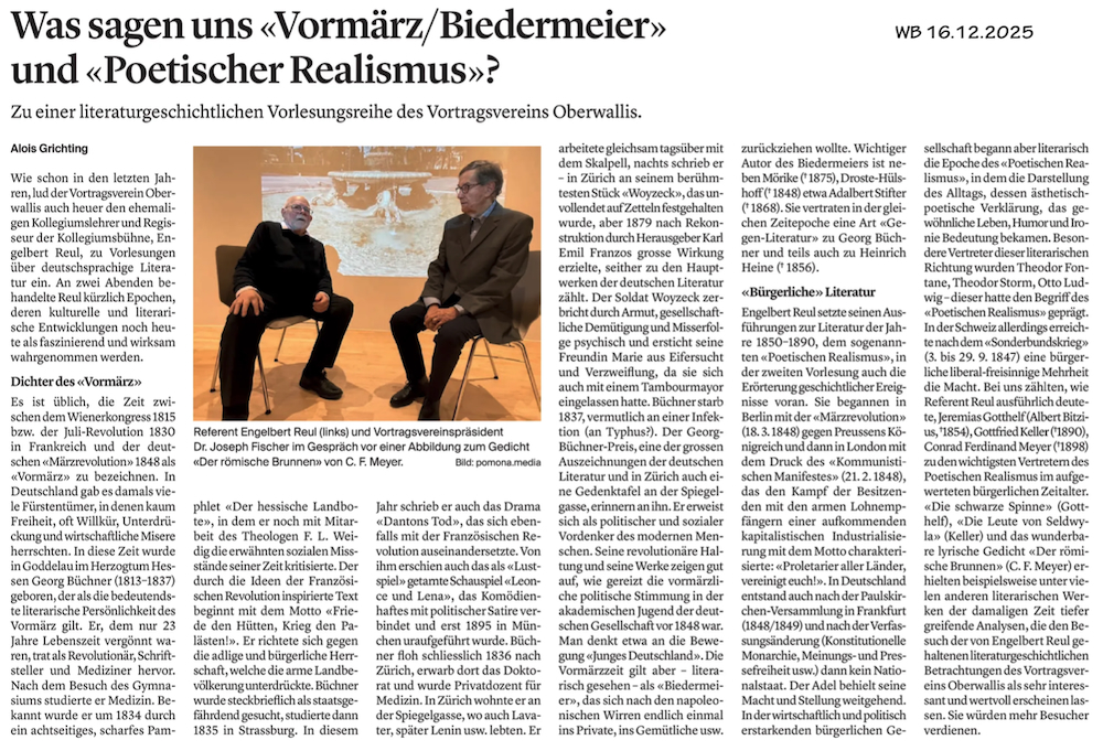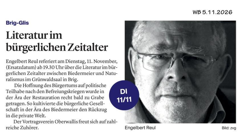 Die Literatur dieser Zeit steht im Zeichen des poetischen Realismus. Jeremias Gotthelf (1797–1854), eigentlich Albert Bitzius, wirkt als reformierter Pfarrer im Emmental und kennt Armut und Aberglauben aus eigener Erfahrung. In Romanen wie „Uli der Knecht“ und „Uli der Pächter“ verbindet er Alltagsrealität mit moralischer Lehre. Seine Novelle „Die schwarze Spinne“ (1842) schildert in eindringlichen Bildern, wie eine Gemeinschaft durch Hochmut und Gottlosigkeit ins Verderben gerät. Thomas Mann (1875–1955) nannte diese Erzählung ein erschütterndes Meisterwerk und lobte ihre dunkle Bildkraft und moralische Strenge. Gottfried Keller (1819–1890) wird in Zürich geboren, verliert früh seinen Vater und versucht sich zunächst als Maler. Nach Aufenthalten in Heidelberg und Berlin wird er Staatsschreiber des Kantons Zürich. In „Der grüne Heinrich“ schildert er den Weg eines scheiternden Künstlers, in „Die Leute von Seldwyla“ und „Züricher Novellen“ zeigt er ein kritisches Bild des Bürgertums. Besonders „Romeo und Julia auf dem Dorfe“ macht den Zerfall bürgerlicher Ehrvorstellungen sichtbar, während „Das Fähnlein der sieben Aufrechten“ republikanische Ideale betont. Conrad Ferdinand Meyer (1825–1898) stammt aus einer Zürcher Patrizierfamilie, wird durch den frühen Freitod seiner Mutter geprägt und leidet unter seelischen Krisen. Er wird vor allem durch seine historischen Romane und Novellen bekannt, etwa „Jürg Jenatsch“ über die Bündner Wirren im Dreissigjährigen Krieg und „Gustav Adolfs Page“. Neben der Prosa ist seine Lyrik besonders bedeutend, vor allem das Gedicht „Der römische Brunnen“ (1882), das für seine formale Strenge und Bildkraft bekannt ist. Im europäischen Raum schildern Gustave Flaubert (1821–1880) in „Madame Bovary“ und Leo Tolstoi (1828–1910) in „Anna Karenina“ die konfliktreiche Spannung zwischen persönlichem Glück und bürgerlicher Moral. Die Oper „Carmen“ von Georges Bizet (1838–1875) macht diese Gegensätze auch musikalisch sichtbar. Adalbert Stifter (1805–1868) entwirft in „Der Nachsommer“ und „Witiko“ das Ideal einer ruhigen, moralisch geordneten Welt. Mit Friedrich Nietzsche (1844–1900) und seinem Werk „Menschliches, Allzumenschliches“ (1878) beginnt eine radikale Kritik an traditionellen Moral- und Wahrheitsvorstellungen. So zeigt die Literatur des 19. Jahrhunderts, wie eng politische Umbrüche, gesellschaftliche Entwicklungen und die Lebenswege der Autoren miteinander verbunden sind und wie Literatur zum Spiegel ihrer Zeit wird. Unser herzlicher Dank gilt Herrn Engelbert Reul für sein hervorragendes Referat, das gleichermassen informativ, lebendig und anregend war.